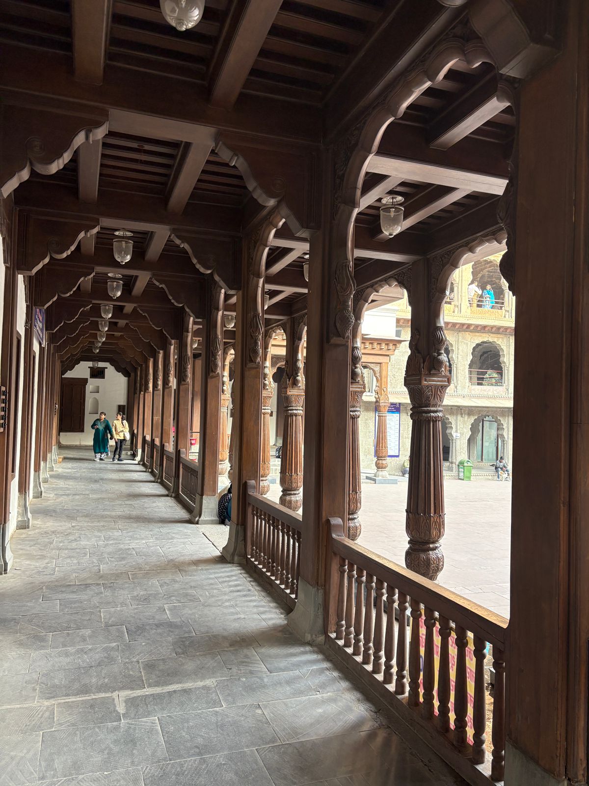 As you approach the palace, the grand façade immediately captures your attention. The massive wooden entrance gate, adorned with iron studs, leads you into a courtyard surrounded by beautifully carved balconies and jharokhas. The intricate detailing on the walls and the arches reflects the skill and craftsmanship of the artisans of that era.