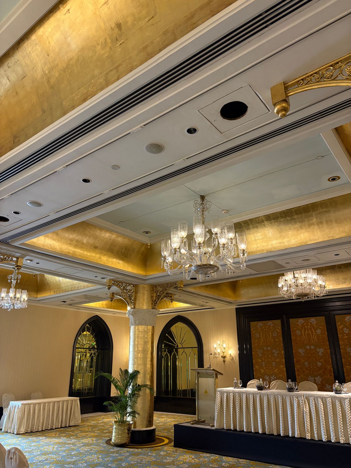 The Grand Ballroom at Taj Mumbai is a marvel of craftsmanship. The most striking feature of this regal space is its steel pillars, intricately coated in gold, a rare architectural element that adds to its magnificence. These pillars not only enhance the visual splendor but also showcase the grandeur and attention to detail that defines the Taj Mahal Palace.